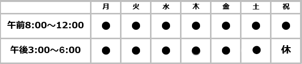 | 受付時間 | 午前8:00〜12:00 午後3:00〜6:00 ※1200〜3:00まで往診 |